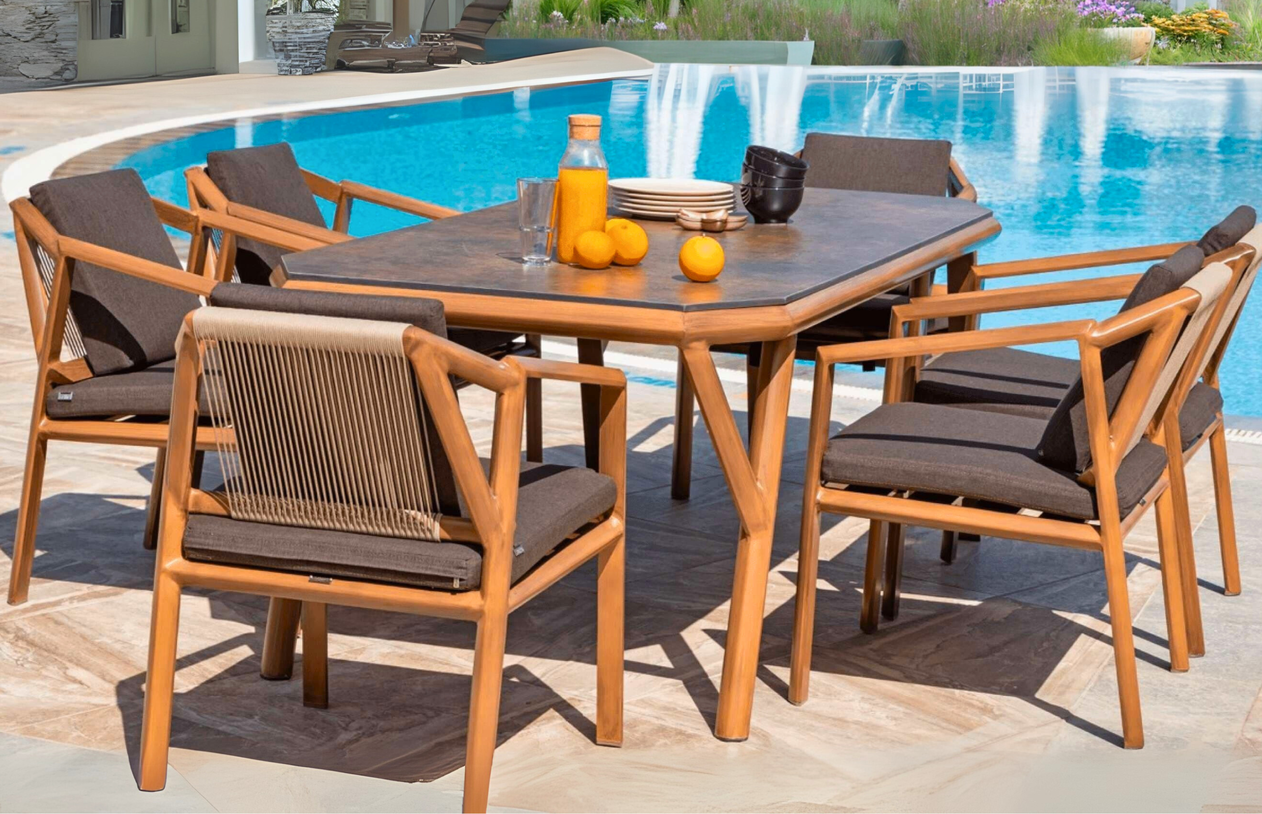 Die Aria Set Dining vereint Komfort und Eleganz im Außenbereich. Mit robustem Aluminiumrahmen, modernen Design und bequemen Kissen bietet sie langlebige Qualität und hohen Sitzkomfort. Ideal für gesellige Momente, verwandelt sie Garten oder Terrasse in einen stilvollen Wohnraum. Die perfekte Wahl für hochwertige Outdoor-Essmöbel.