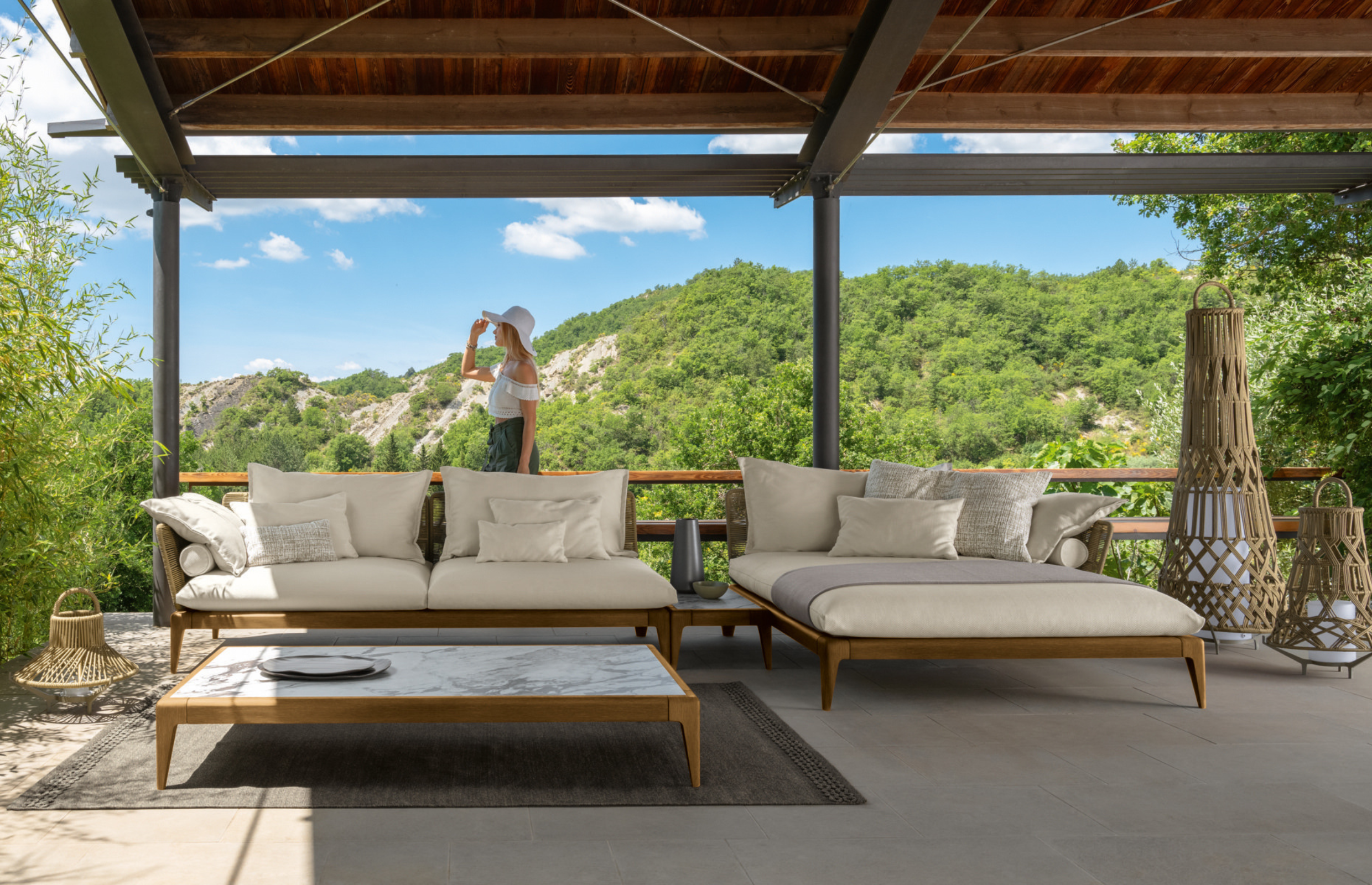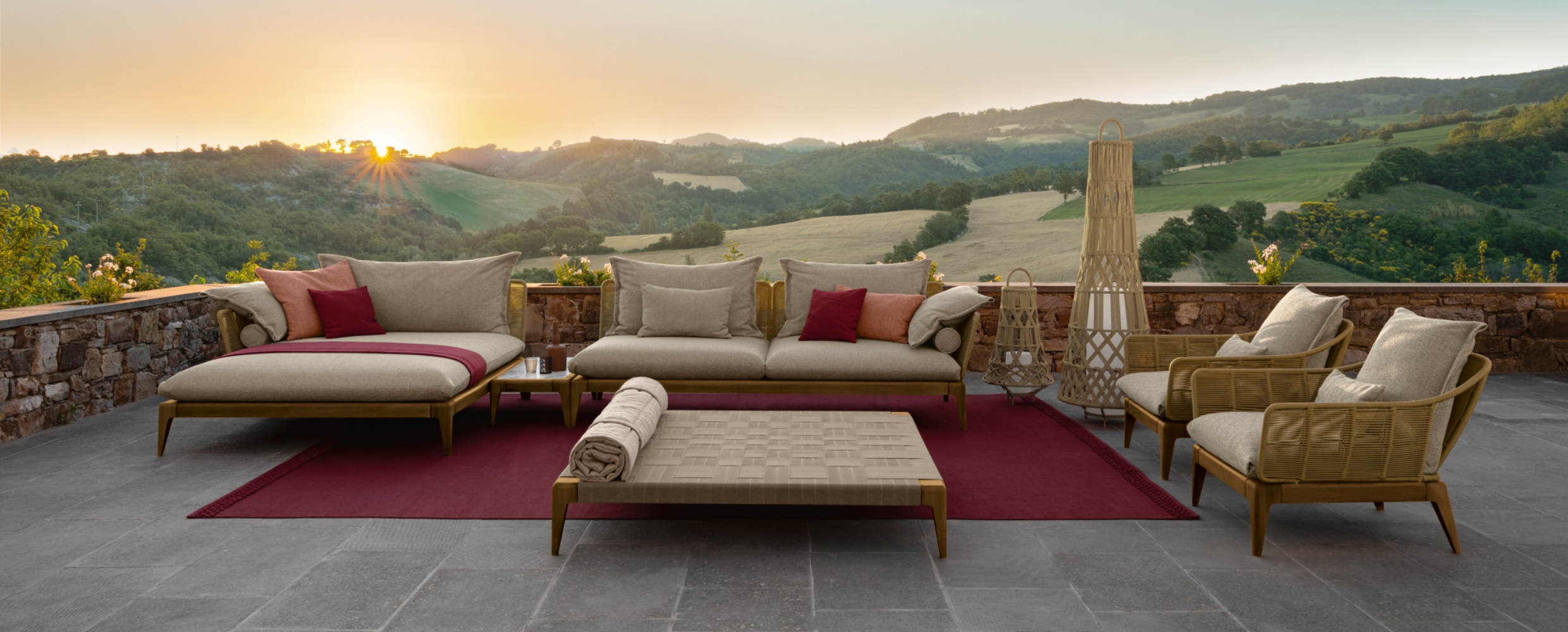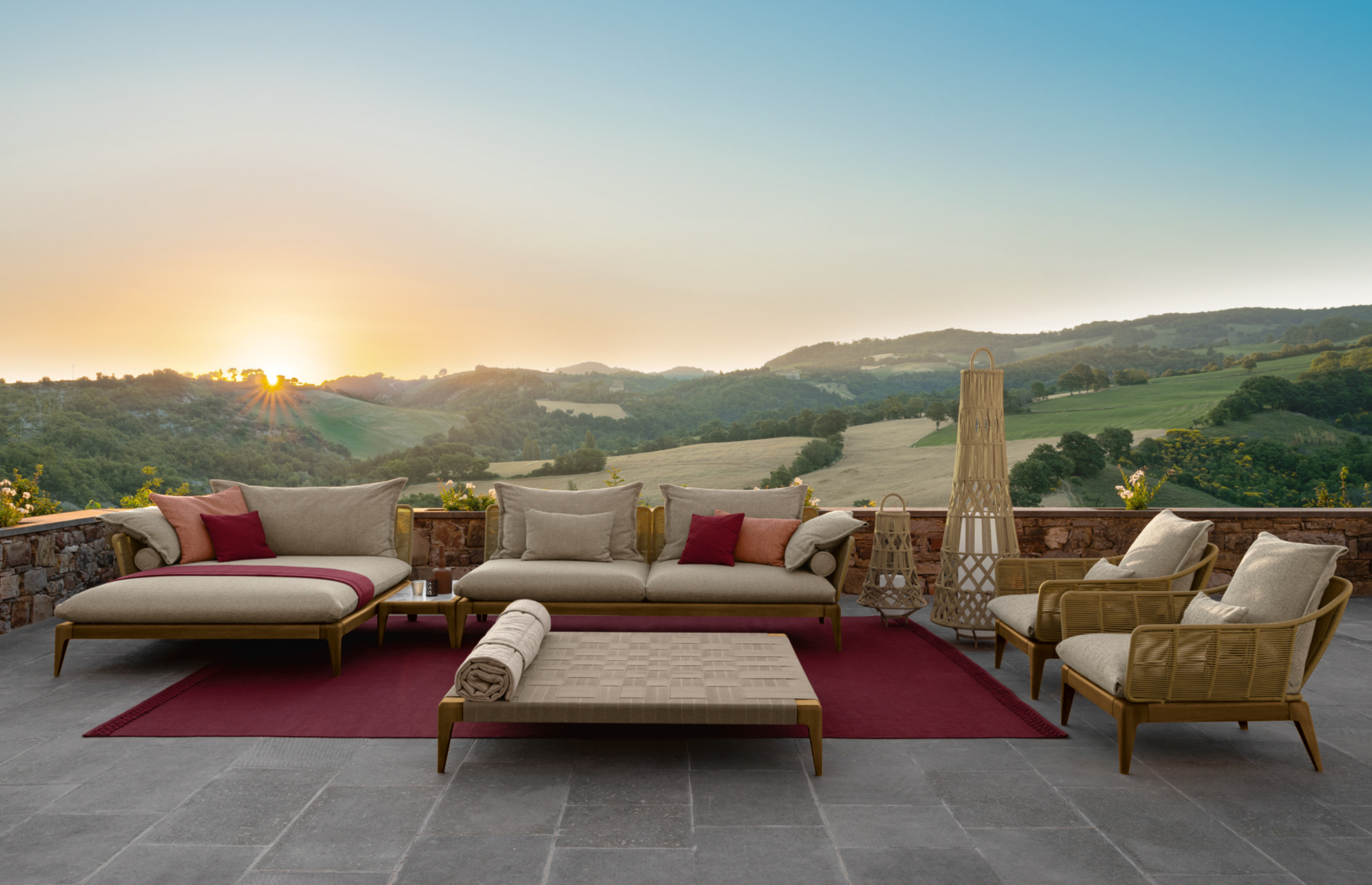 Inspiriert von der Welt der Seefahrt entstand die Vega-Kollektion aus dem Wunsch heraus, die einzigartigen Emotionen hervorzurufen, die nur eine Überquerung der schönsten Meeren der Welt hervorrufen kann. Die Verwendung edler Materialien wie Holz im Sockel, verbunden mit einer sorgfältigen Stoffauswahl, verleiht der gesamten Linie eine elegante und raffinierte Ausstrahlung. Das Seil, der wahre Protagonist, umhüllt die Rückenlehnen und Armlehnen jedes Sitzelements der Kollektion: Wohnzimmersessel, Sofas mit modularer oder fester Struktur und Esszimmersessel.