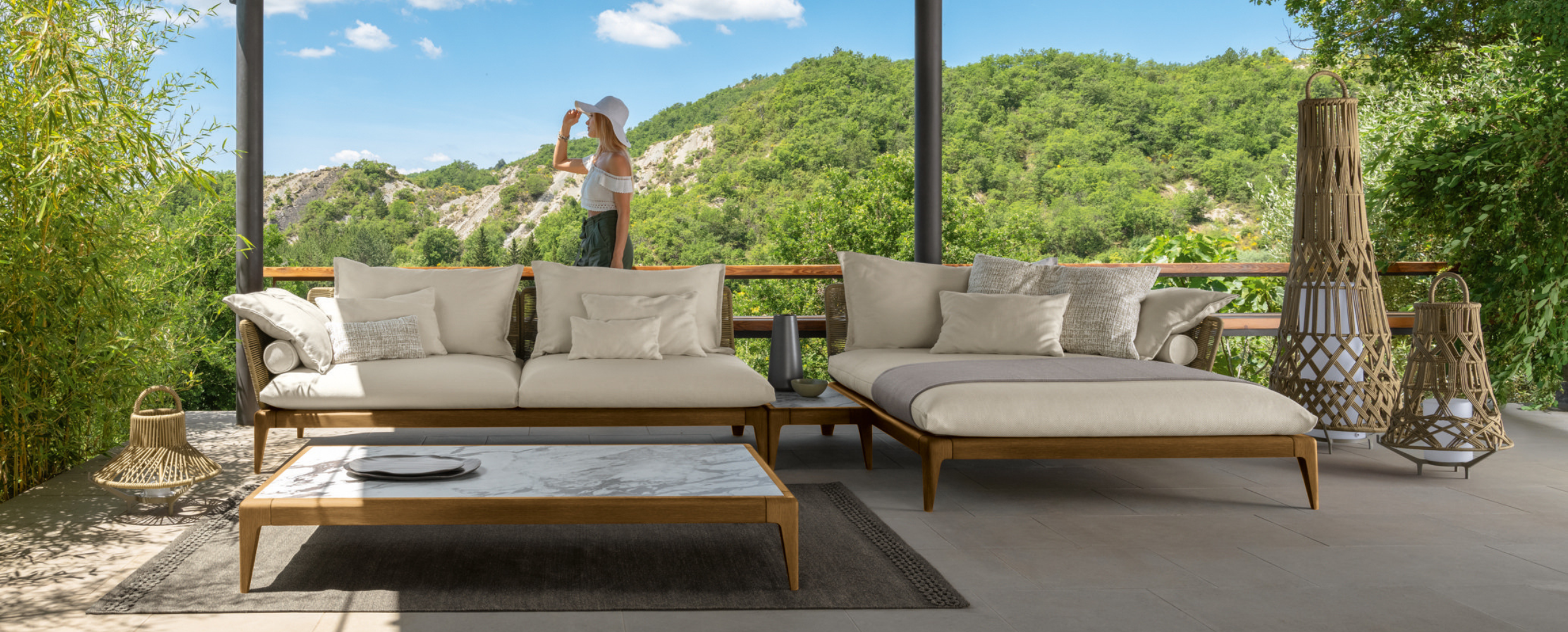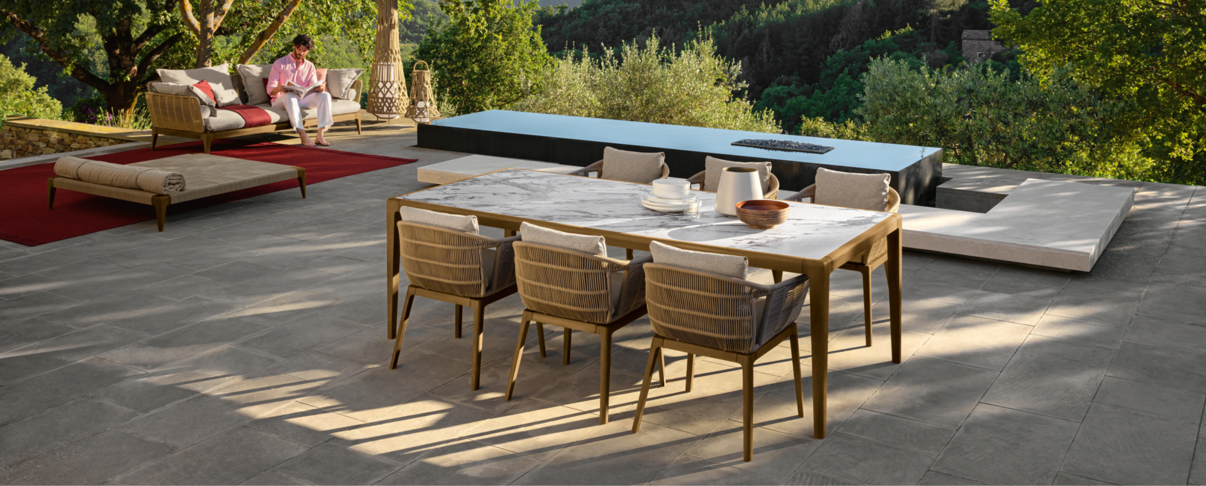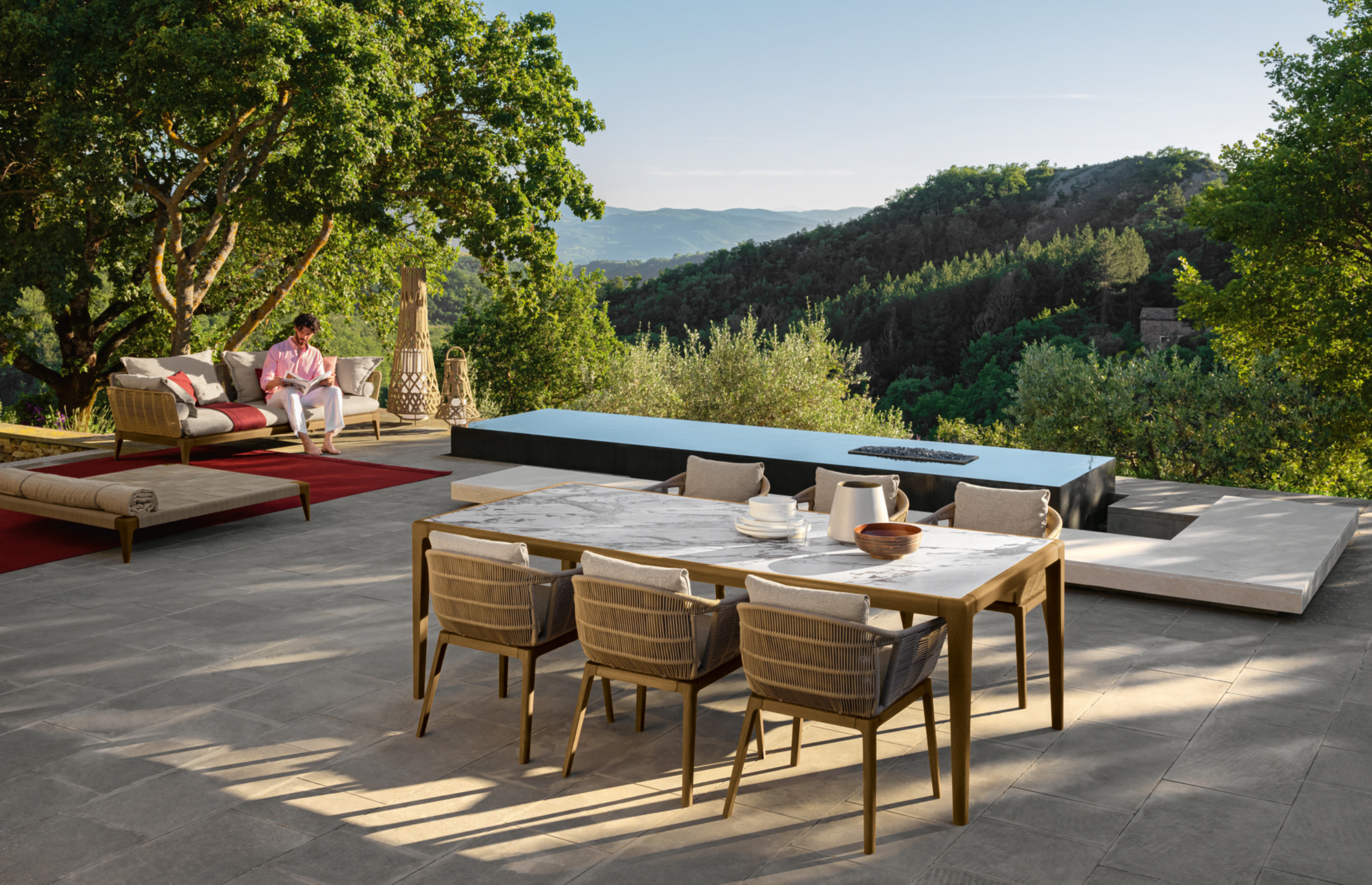 Inspiriert von der Welt der Seefahrt entstand die Vega-Kollektion aus dem Wunsch heraus, die einzigartigen Emotionen hervorzurufen, die nur eine Überquerung der schönsten Meeren der Welt hervorrufen kann. Die Verwendung edler Materialien wie Holz im Sockel, verbunden mit einer sorgfältigen Stoffauswahl, verleiht der gesamten Linie eine elegante und raffinierte Ausstrahlung. Das Seil, der wahre Protagonist, umhüllt die Rückenlehnen und Armlehnen jedes Sitzelements der Kollektion: Wohnzimmersessel, Sofas mit modularer oder fester Struktur und Esszimmersessel.