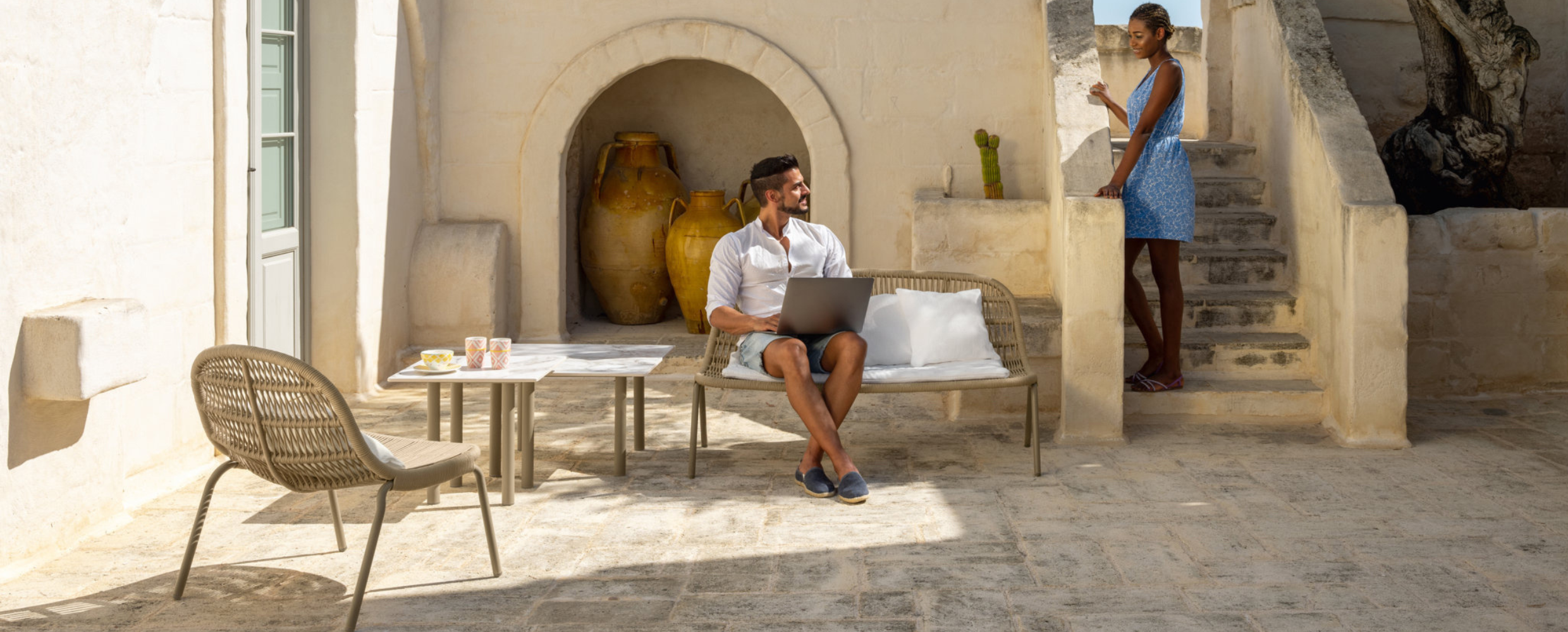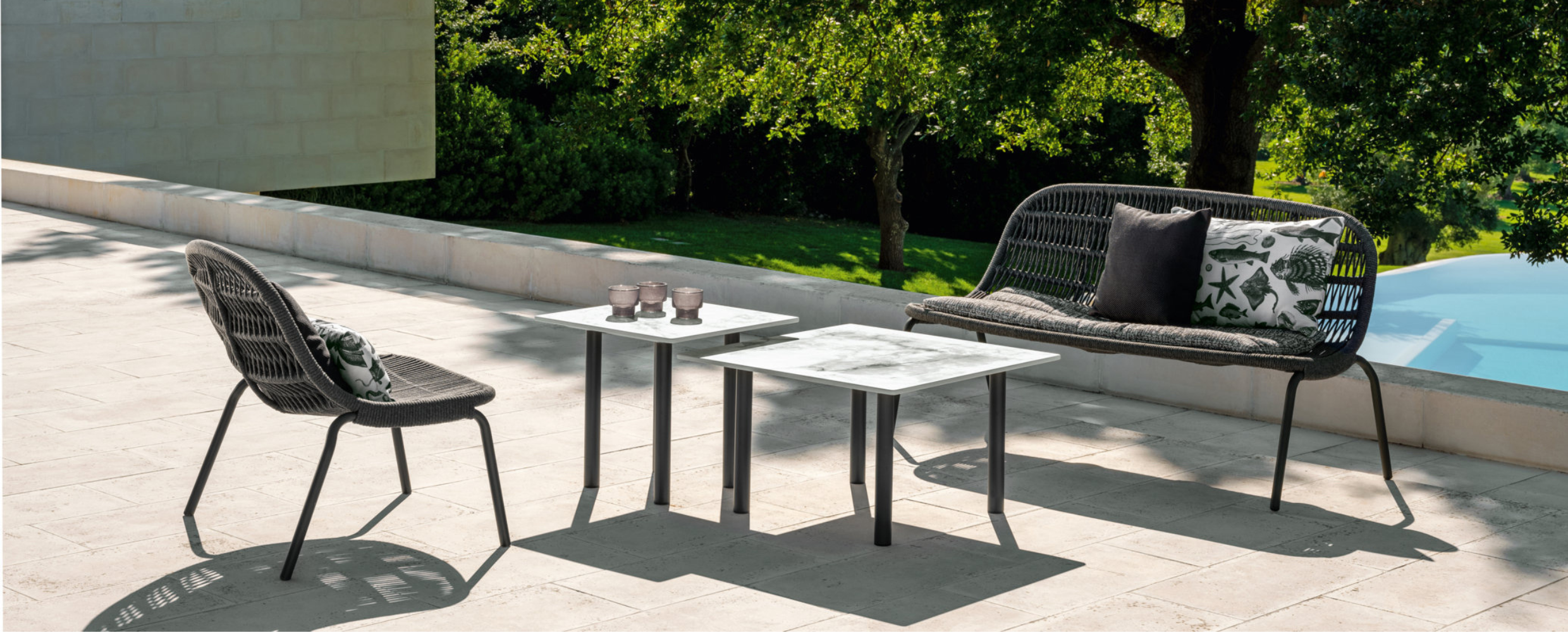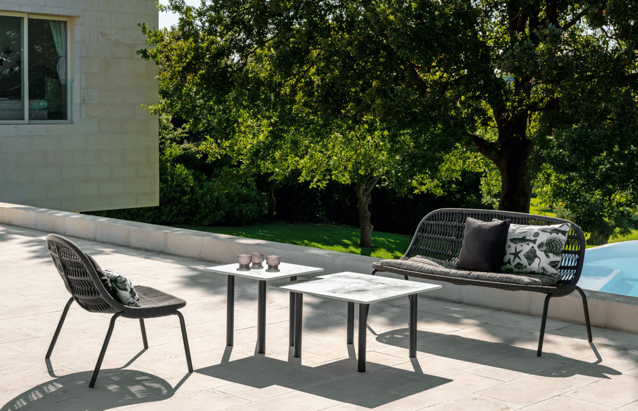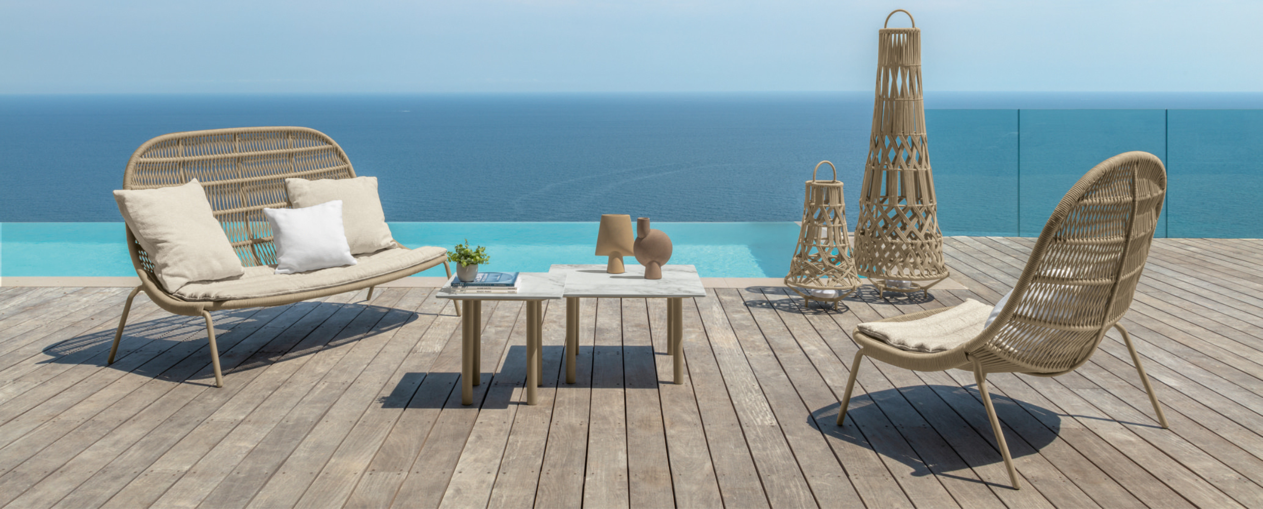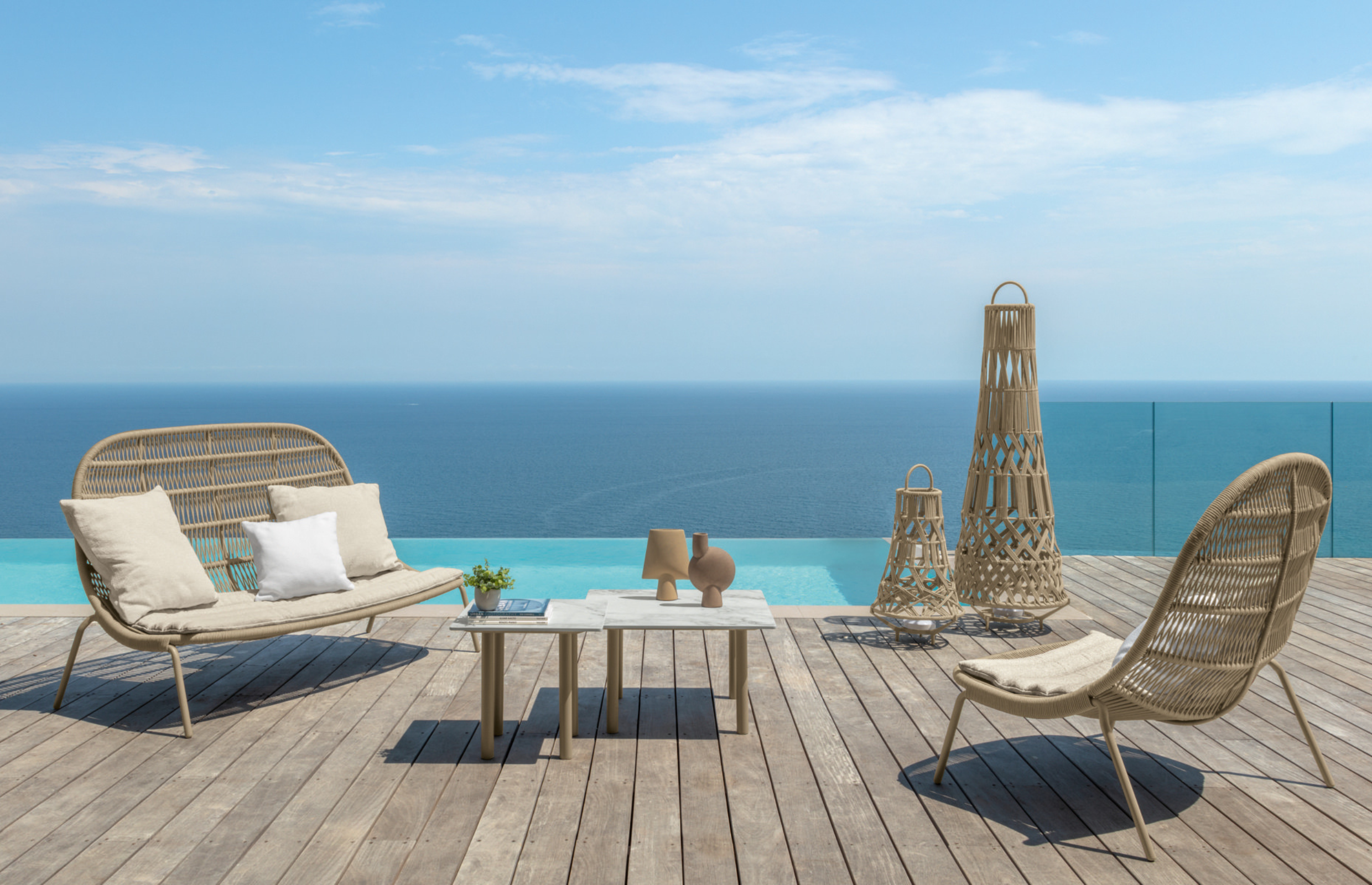 Die Kollektion Izar entstand aus dem Wunsch, das Schwingen von Palmen, die von der Meeresbrise bewegt werden, und die Geschmeidigkeit von Steinen, die vom Wasser geformt wurden, wiederzugeben. Sie umfasst Stühle, Lounges, Hocker, Sonnenliegen, Poufs und Sofas mit großzügigen Formen, bei denen die Linien der verflochtenen Seile, die von den Sonnenstrahlen gekreuzt werden, ein Spiel aus Licht und Schatten erzeugen.